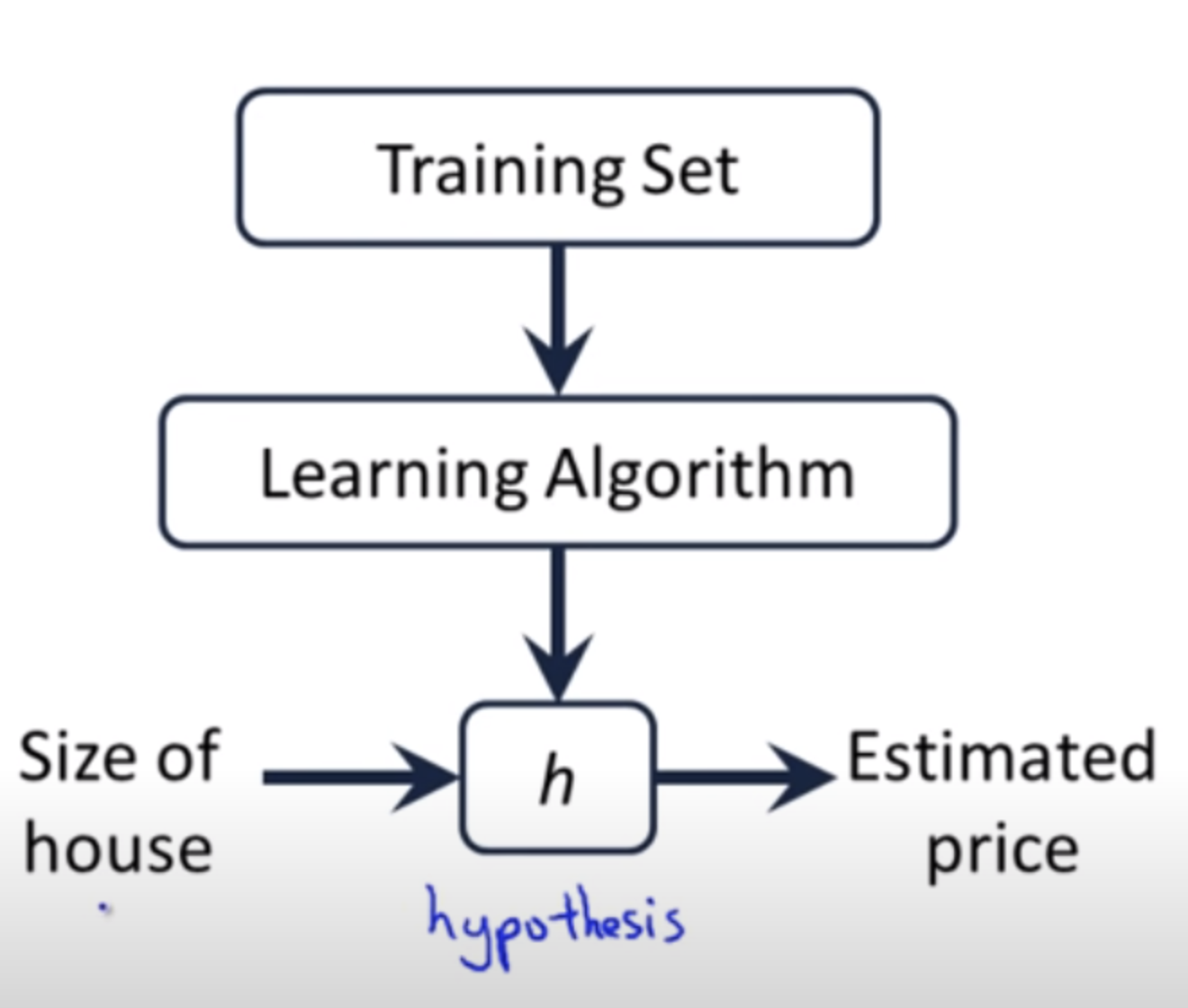 \[\mathcal{L}(\mathbf{w}) = \frac{1}{N} \sum_{i=1}^{N} (y_i - \mathbf{w}^\top \mathbf{x}_i)^2 = \frac{1}{N} \| \bar{\mathbf{X}} \mathbf{w} - \bar{\mathbf{y}} \|_2^2\]Nhắc lại một chút về khái niệm hàm mất mát. Trong các mô hình học có giám sát của machine learning, từ dữ liệu đầu vào, thông qua phương pháp học tập (learning algorithm), chúng ta sẽ đặt ra một hàm giả thuyết $h$ (hypothesis function) mô tả mối quan hệ dữ liệu giữa biến đầu vào và biến mục tiêu.