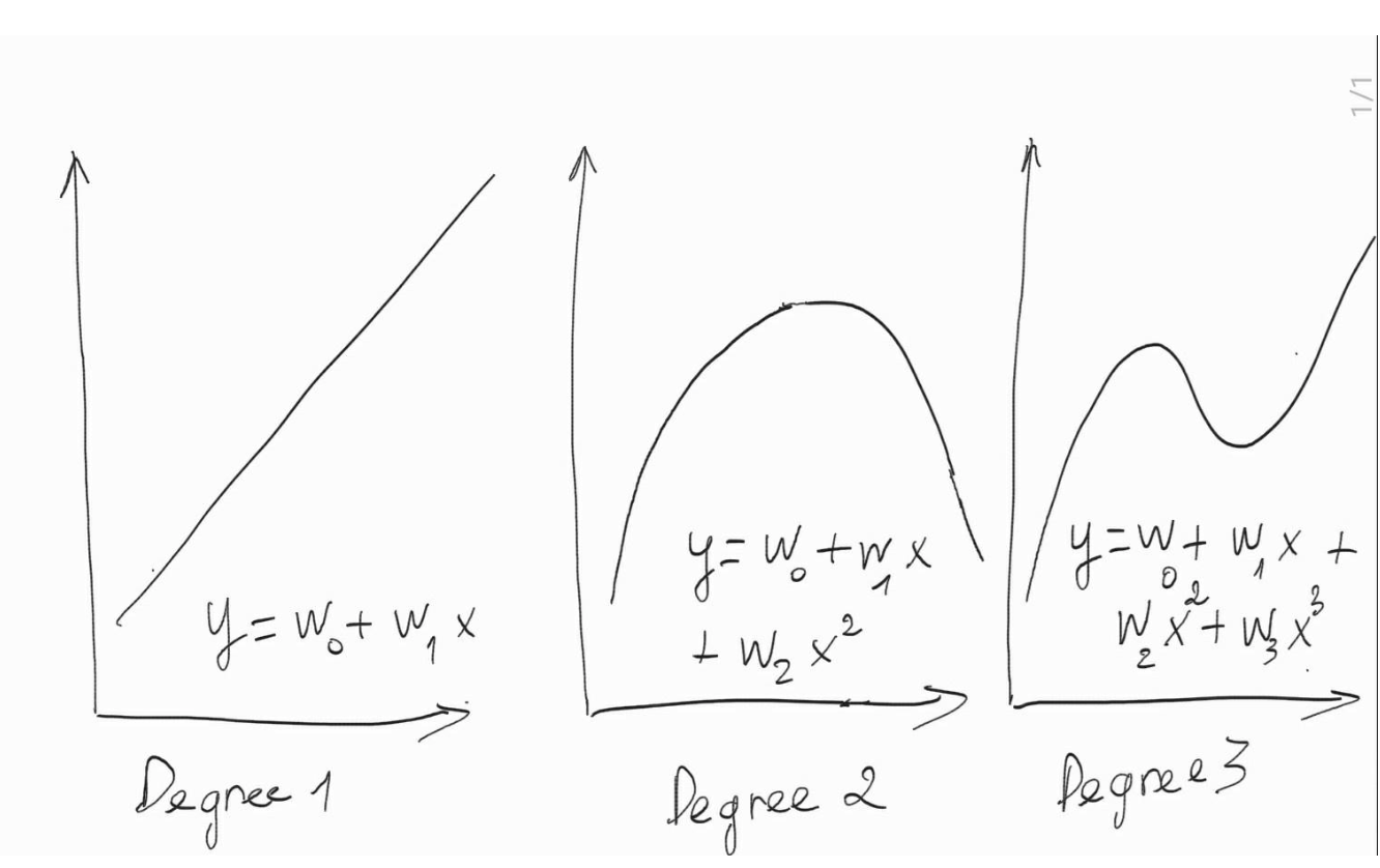 Hình trên thể hiện mức độ phức tạp của mô hình theo sự thay đổi của bậc. Phương trình có độ phức tạp lớn nhất là phương trình bậc $3$: $y = w_0 + w_1x + w_2x^2 + w_3x^3$. Trong chương trình THPT chúng ta biết rằng phương trình bậc $3$ thông thường sẽ có $2$ điểm uốn và độ phức tạp lớn hơn bậc hai chỉ có $1$ điểm uốn. Khi $w_3 \to 0$ thì phương trình bậc $3$ hội tụ về phương trình bậc $2$: $y = w_0 + w_1x + w_2x^2$, lúc này phương trình là một đường cong dạng parbol và có độ phức tạp giảm. Tiếp tục kiểm soát độ lớn để $w_2 \to 0$ trong phương trình bậc $2$ ta sẽ thu được một đường thẳng tuyến tính dạng $y = w_0 + w_1x$ có độ phức tạp thấp nhất.