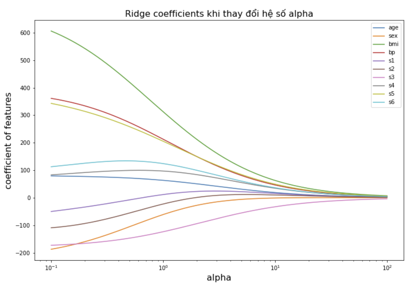Khi tăng dần hệ số $\alpha$ thì hồi qui Ridge sẽ có xu hướng thu hẹp hệ số ước lượng từ mô hình. Chúng ta sẽ thấy rõ thông qua ví dụ mẫu bên dưới.